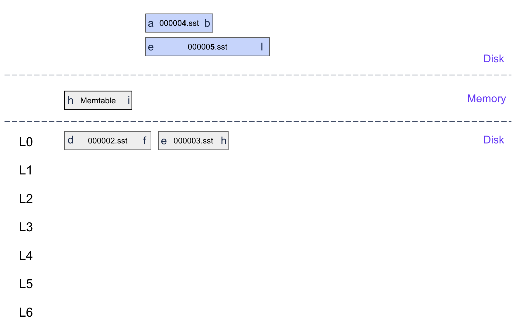 First: The original memtable is flushed to L0, creating SSTable 000007.sst with keys H-I.